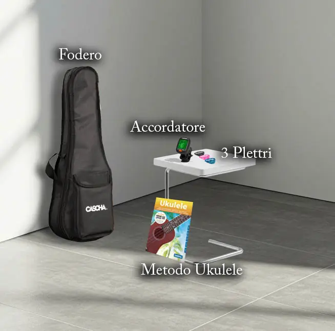 Inclusi in questo bundle ci sono una custodia imbottita da 5 mm, 3 plettri, un pratico accordatore e la scuola di ukulele in 4 lingue “Ukulele – Impara a suonare – Veloce e facile” in tedesco, inglese, francese e spagnolo. Purtroppo manca la traduzione in lingua italiana ma non ci sono problemi, siamo qui per te, e con la nostra filosofia del PENSA PER TE, se hai bisogno, potremo aiutarti a capire meglio!