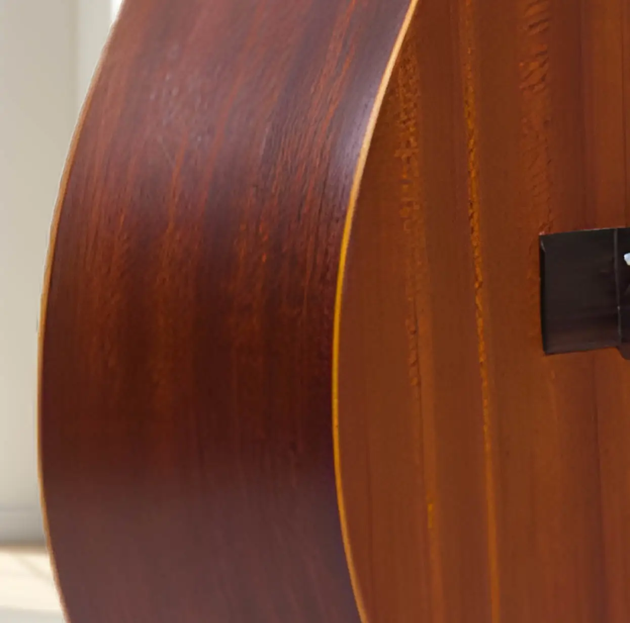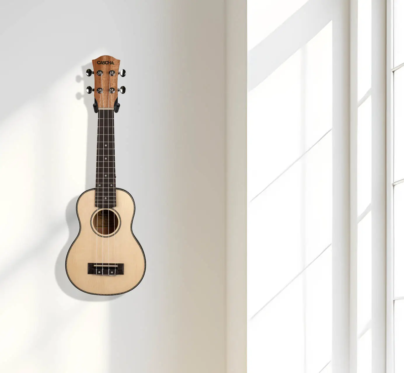 L’ukulele Solid Top Cascha 2149, convince subito fin dall’inizio per la sua ottima fattura. La parte superiore è realizzata in legno massello di abete rosso. La bella e uniforme venatura non è solo un punto forte visivo. Come legno superiore per ukulele e chitarre acustiche, l’abete rosso fornisce un suono pieno e un feedback potente. Poiché è un po’ più morbido, trasmette le vibrazioni più facilmente. La finitura opaca di classe è stata scelta appositamente per non influenzare il suono. I perni per tracolla integrati consentono di attaccare le cinghie per ukulele. Questo può essere utilizzato per aumentare il comfort e la mobilità durante l’esecuzione.